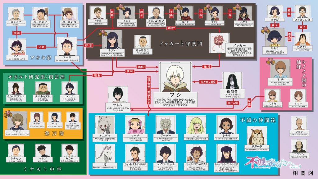2026年02月27日 Season3の登場人物相関図を公開! このたび、アニメ「不滅のあなたへ」のSeason3の登場人物相関図を公開いたしました。 相関図では、主人公・フシを中心に現世編で出会った仲間たち・そしてノッカーや守護団の関係性などをわかりやすくまとめています。 ぜひご覧ください!